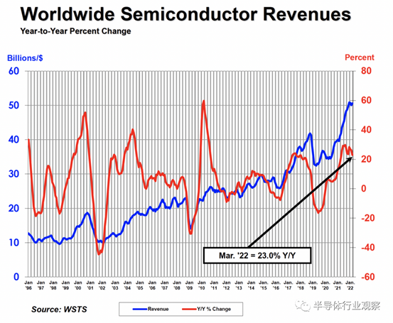 半導(dǎo)體行業(yè)協(xié)會 (SIA) 統(tǒng)計(jì)數(shù)據(jù)顯示,2022年第一季度全球半導(dǎo)體銷售額達(dá)到 1517億美元,較去年同期增長23%。但比2021年第四季度低0.5% 。2022年3月全球銷售額為506億美元,環(huán)比增長1.1%。